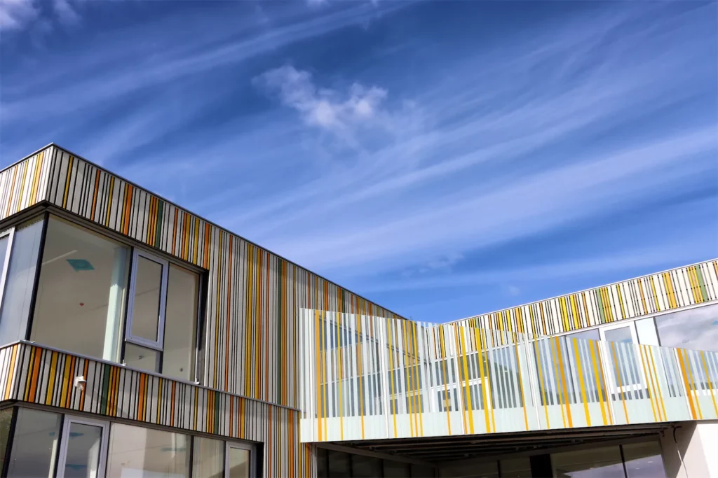 Ob nun technisch oder ästhetisch ist die in Bau befi ndliche Volksschule in Hagenbrunn ein High-TechHingucker mit fröhlicher Regenbogenfassade. Besonderes Highlight in technischer Hinsicht ist eine von Landsteiner umgesetzte innovative KNX/EIB-Gebäudeautomatisierung, die alle haustechnischen Anlagen wie Lüftung, Heizung, Beleuchtung und Beschattung miteinander vernetzt.