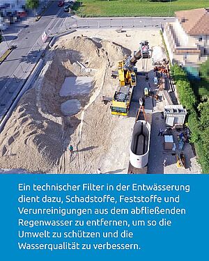 Ein technischer Filter in der Entwässerung dient dazu, Schadstoffe, Feststoffe und Verunreinigungen wie z. B. Öl, Benzin, Reifenabrieb oder Mikroplastik aus dem abfließenden Regenwasser zu entfernen, bevor es in das Grundwasser gelangt. Er schützt so die Umwelt, erfüllt gesetzliche Vorgaben und verbessert die Wasserqualität.