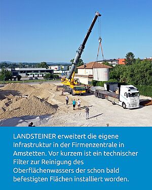 Im Zuge der Erweiterung unserer Infrastruktur entsteht derzeit auf dem gegenüberliegenden Grundstück der LANDSTEINER-Zentrale in der Kruppstraße 3, 3300 Amstetten, ein moderner Parkplatz, der nicht nur Platz für Fahrzeuge bietet, sondern auch ein klares Zeichen für Nachhaltigkeit und Innovation setzt. Kürzlich ist ein technischer Filter zur Reinigung des Oberflächenwassers der bestigten Fläche installiert worden.
