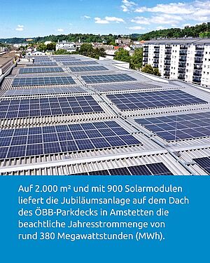 Auf gut 2.000 m² Fläche des Parkdecks in Amstetten wurden hierfür rund 900 PV-Paneele von Projektleiter Günter Kastner und Obermonteuer Martin Gundacker installiert und vor einem Jahr in Betrieb genommen.